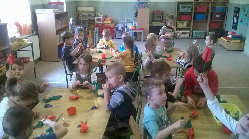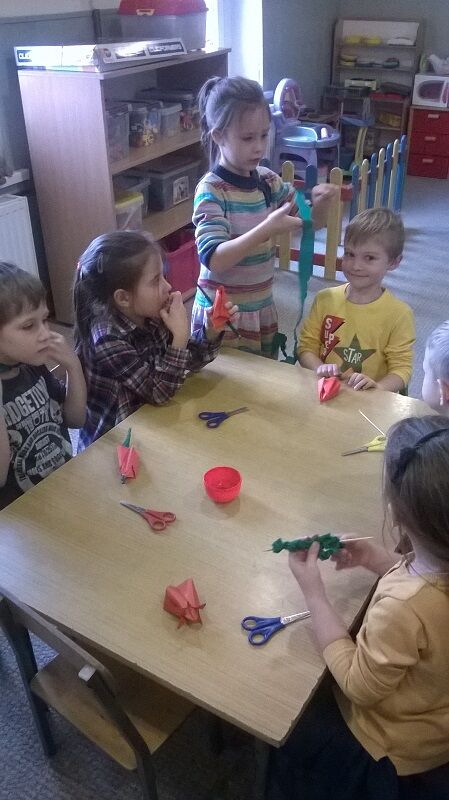 Madzia postanowiła pochwalić się jednym ze swoich talentów. Dziewczynka przygotowała i poprowadziła zajęcia plastyczne, podczas których uczyła dzieci ze swojej grupy, jak złożyć tulipana z papieru metodą origami. Dziewczynka zadbała o to, by wytłumaczyć przedszkolakom każdy najdrobniejszy szczegół tego zadania, a oni słuchali jej "z zapartym tchem". Brawo Madzia! :)