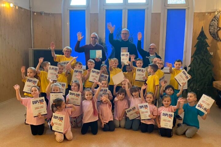 Goście wysłuchali mini programu artystycznego, rozmawiali z dziećmi na temat zajęć, na które uczęszczają, a na koniec osobiście wręczyli dzieciom pamiątkowe dyplomy ,,Sprawny Jelonek”.