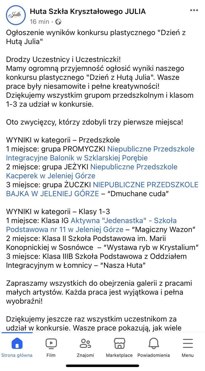 Jesienią Huta Szkła Julia w Piechowicach ogłosiła konkurs plastyczny pt.:,,Dzień z Hutą Julia” skierowany do przedszkoli i szkół podstawowych.