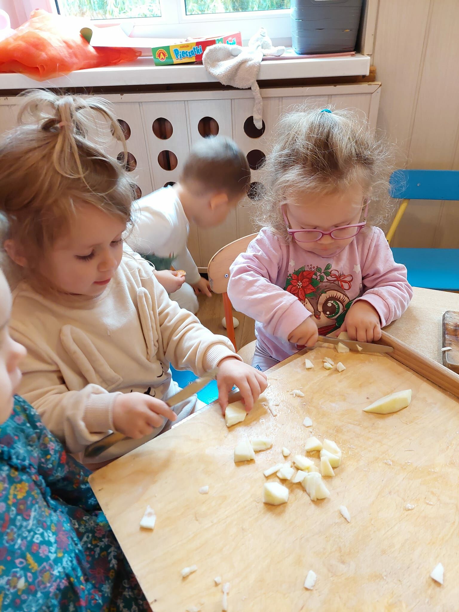 Jesień to cudowny czas mieniący się kolorami barw. To czas zbiorów jakimi obdarza nas przyroda, przygotowywania z nich przetworów. W poszczególnych grupach w przedszkolu sezon na sałatki owocowe również został otwarty. W ruch poszły deski, stolnice, noże, miski, łyżki. Najpierw jednak krótkie przypomnienie zasad higieny i bezpieczeństwa. Młodsi i starsi ochoczo zakasali rękawy do pracy. Efekty pracy były bardzo smakowite, pełne witamin.