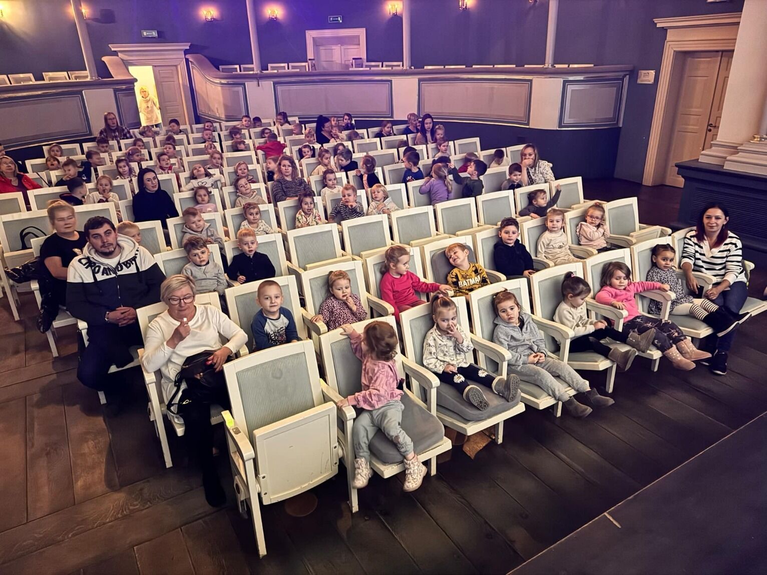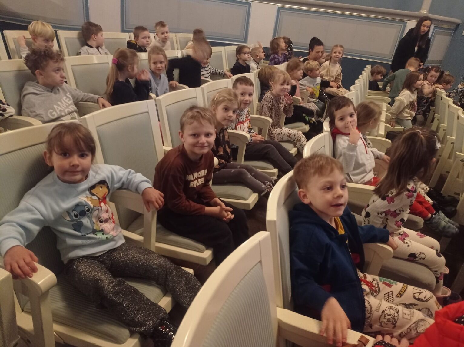 w spektaklach dla dzieci, a także sposób ich ożywiania. Na zakończenie spotkania przedszkolaki z Panią prowadzącą mini lekcję nt teatru udały się na balkon, by z niego podziwiać scenę i widownię. Pełne wrażeń, zadowolone powróciły do przedszkola.
