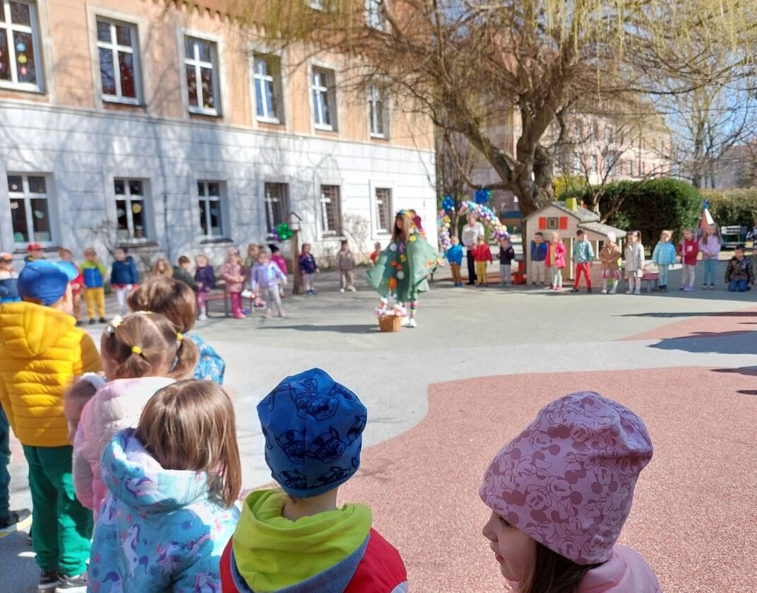 Od kilku dni przedszkole szykowało się na nadejście tej pory roku. Korytarze i sale rozkwitły przybrane w dekoracje i prace dzieci, a przedszkolaki z akcentem zieleni i żółtego w swym ubiorze podkreśliły ten uroczysty dzień. Słoneczny piątek zgromadził najmłodsze i starsze przedszkolaki w ogrodzie przedszkolnym, by rozpocząć wiosenną przygodę z Panią Wiosną przy wtórze radosnych okrzyków, śpiewu i tańca. Przybyła Wiosna rozdawała cukierki zamiast kwiatów, którym zima nie dała obudzić się na całego. Starszaki zaś udały się z Wiosenką na ulice miasta ogłaszając nadejście upragnionej pory roku.