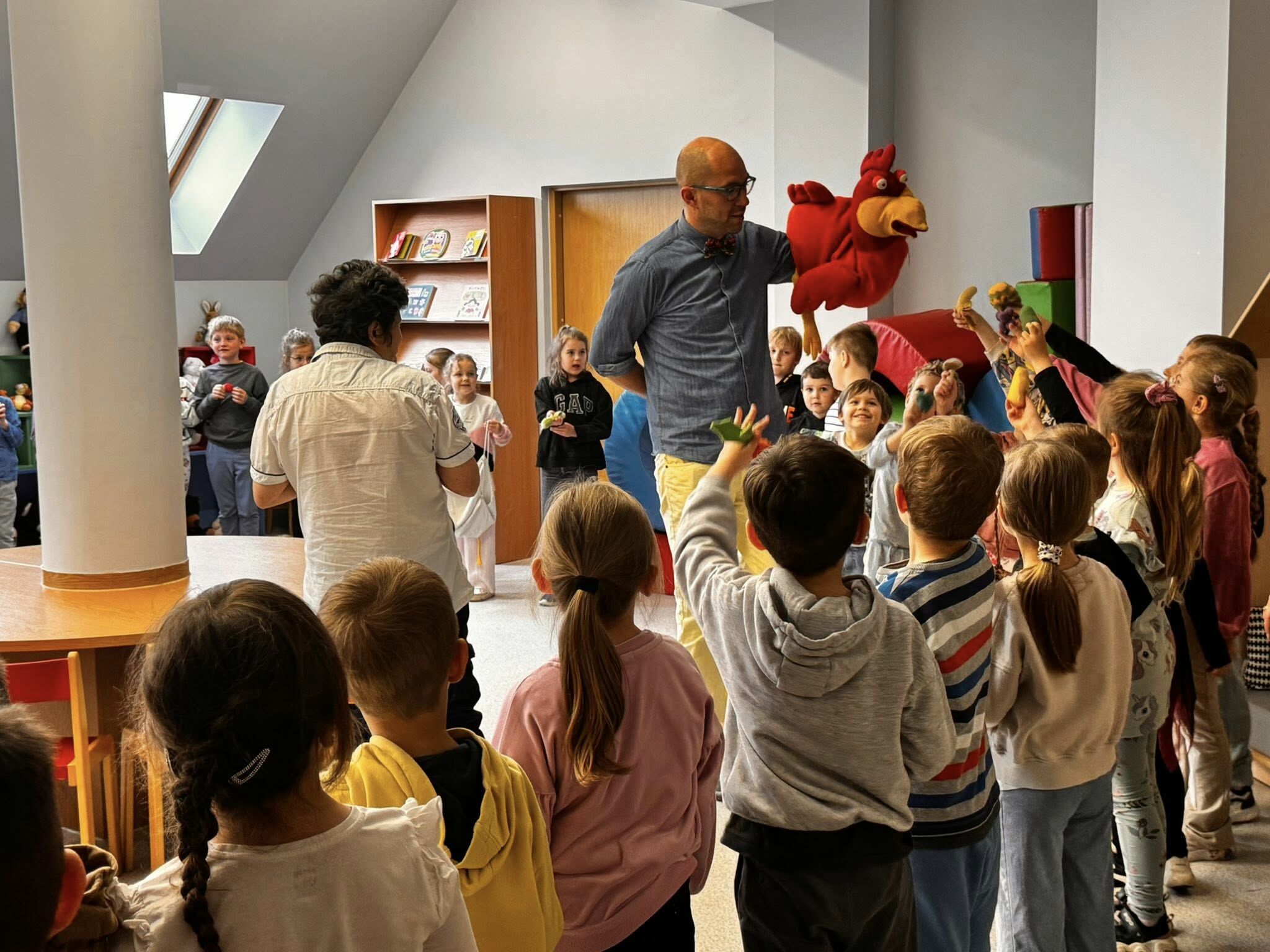 W środowy poranek, tuż po śniadaniu grupa ,,Żuczki” wraz z wychowawcą udała się do Książnicy Karkonoskiej w Jeleniej Górze na spotkanie z Panem Michałem - autorem książek dla dzieci pisanych wierszem, a znanego jako Pan Poeta. Podczas spotkania Pan Poeta zapoznał dzieci ze swoją twórczością, przeczytał dzieciom kilka wierszy ze swoich książek. Oprócz tego były wspólne zabawy z artystą i mnóstwo śmiechu. Na zakończenie można było zakupić pamiątkowe książeczki wraz z autografem.