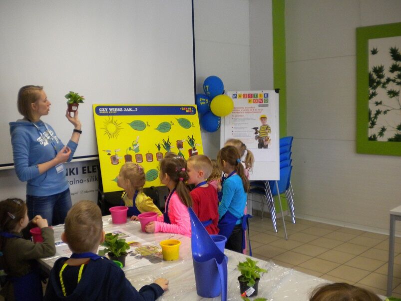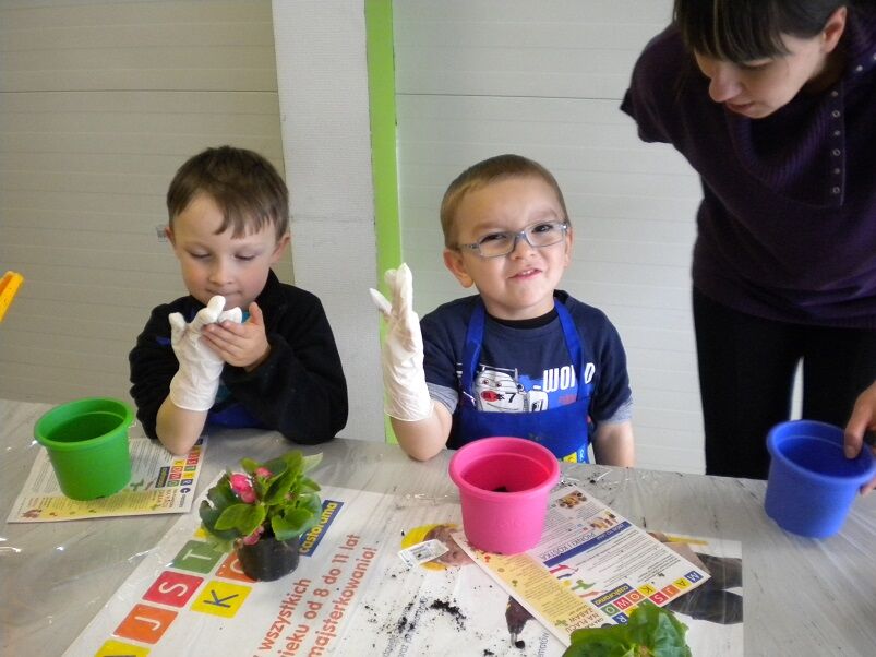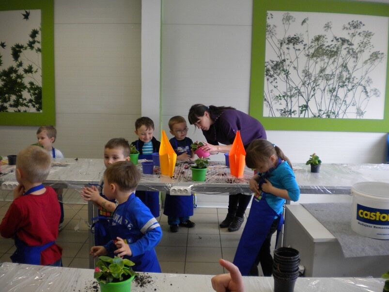 Zajęcia zostały przeprowadzone przez animatora, dostosowane do wieku i możliwości dzieci. Na zajęciach użyto materiałów dostępnych w markecie Castorama. Dzieci otrzymały kwiaty i kolorowe doniczki, zapoznały się ze sposobem przesadzania kwiatów. Animatorka prezentowała sposób pielęgnacji kwiatów. Dzieci wsadzały kwiaty do kolorowych doniczek i zasypywały ziemią. Następnie ozdabiały doniczki kolorowymi piankami i wyklejały w doniczkach swoje imię. Na zakończenie dzieci otrzymały poczęstunek, dyplom, upominki oraz swoje prace.