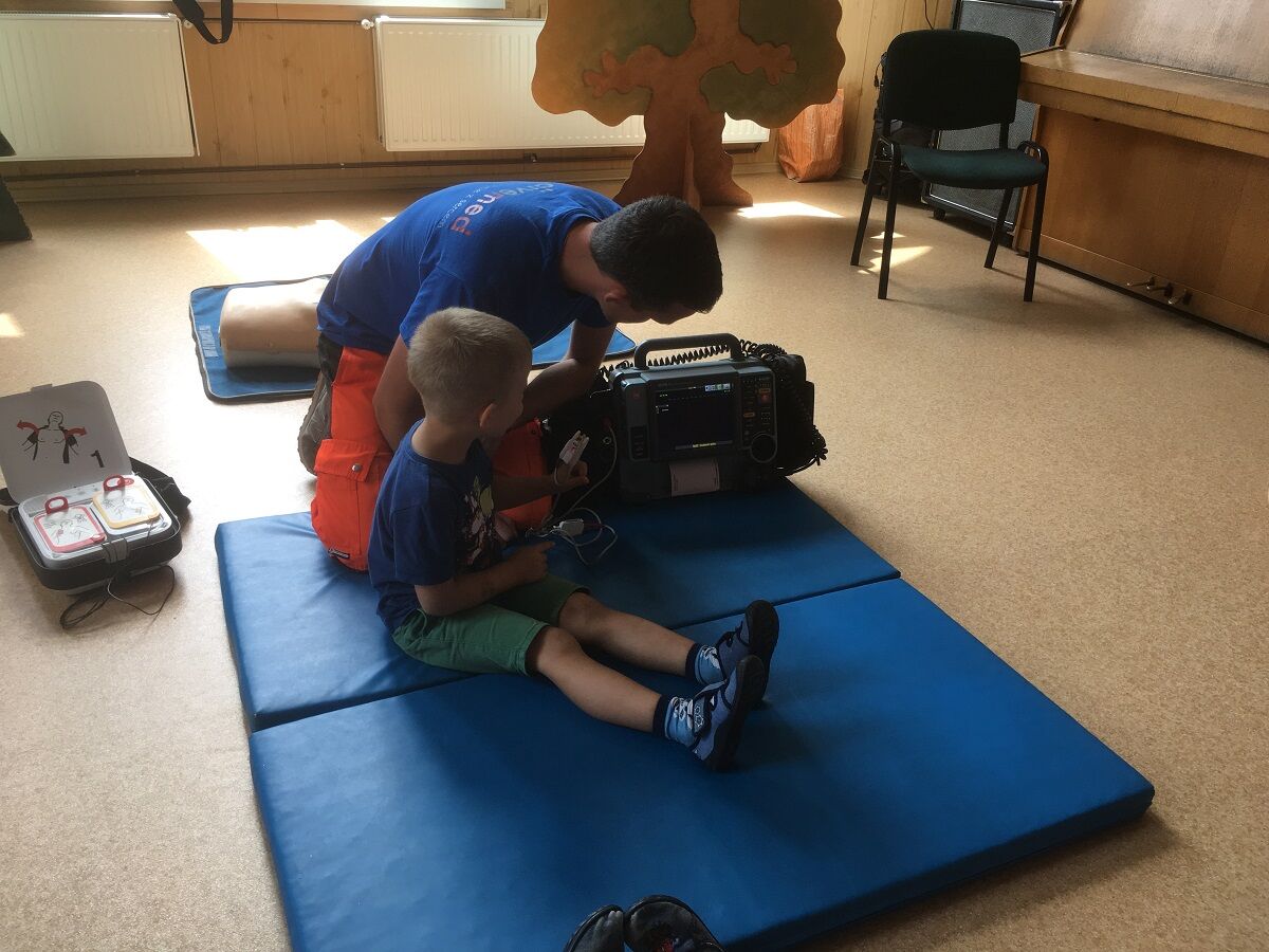 Dzisiaj w naszym przedszkolu odbyło się spotkanie z ratownikami medycznymi firmy „Divmed”. Dzieci z grupy „Mrówki” i „Pszczółki” poznały zasady udzielania pierwszej pomocy osobom potrzebującym, określania czynności życiowym za pomocą zmysłów, układania poszkodowanego oraz sposobu powiadamiania odpowiednich służb. Miały też okazję uczestniczyć w pokazie resuscytacji, działania dwóch defibrylatorów oraz sprzętu do mierzenia poziomu tlenu we krwi oraz ciśnienia. Na zakończenie dzieci oglądały wyposażenie karetki, a także były świadkami udzielania pierwszej pomocy jednemu z kolegów, który obił kolano. Spotkanie z ratownikami wywarło ogromne wrażenie na dzieciach i nauczyło je, jak powinny zachowywać się w sytuacjach zagrożenia zdrowia kolegów i najbliższych.