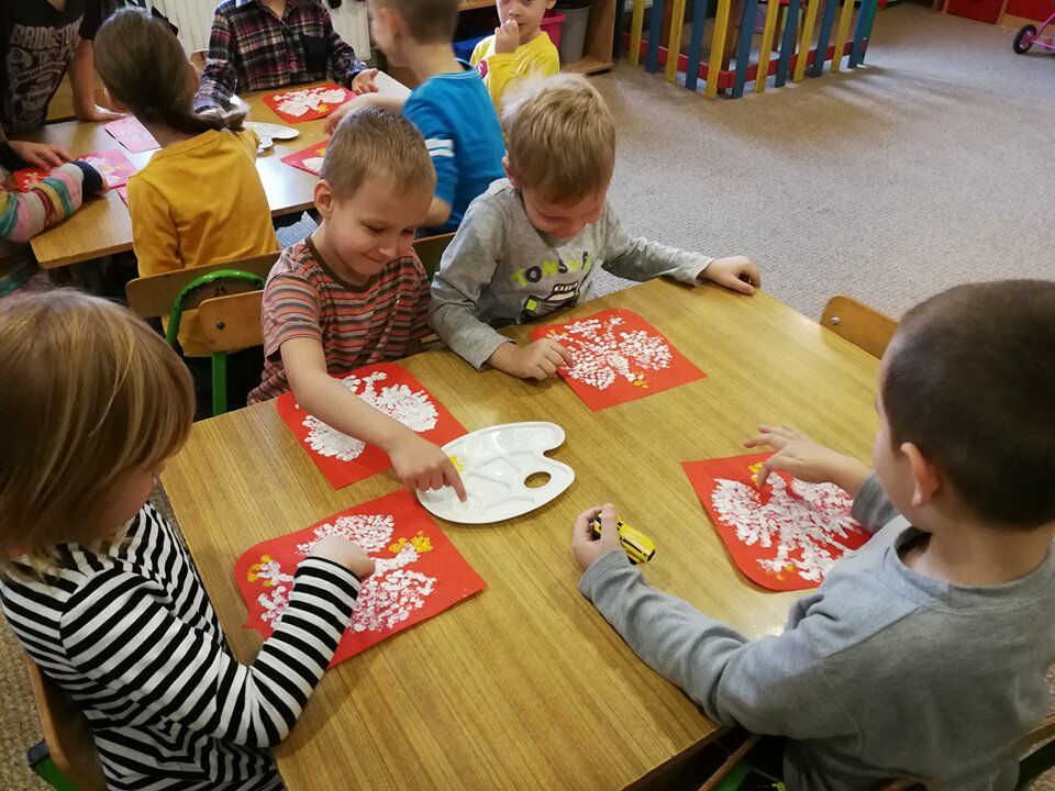 W naszym przedszkolu zrobiło się bardzo patryiotycznie, gdy w każdej sali wybrzmiał Hymn Polski, a na tablicach zawisły biało-czerwone flagi. Dzieci wykonywały także Godła Polski, posługując się różnymi technikami plastycznymi. Efekty ich pracy są niezwykłe!