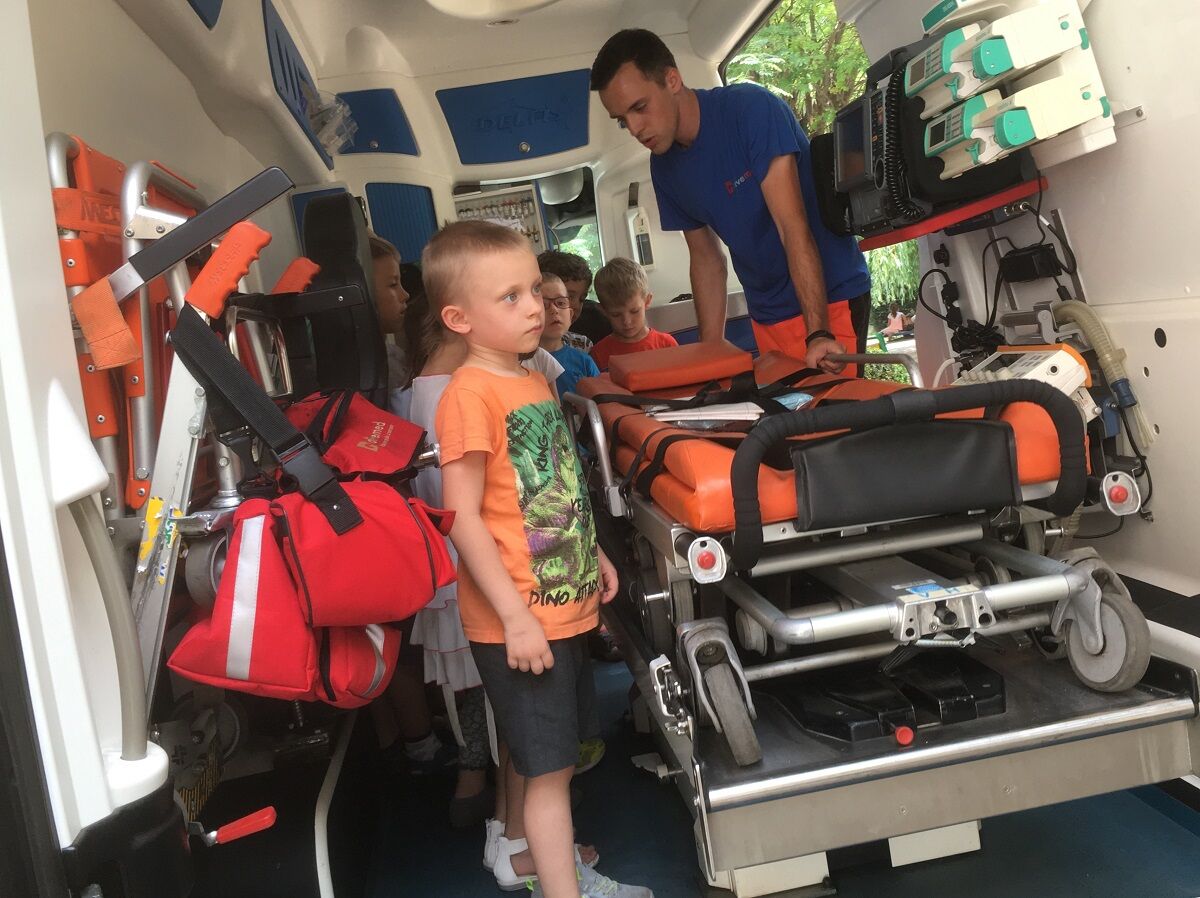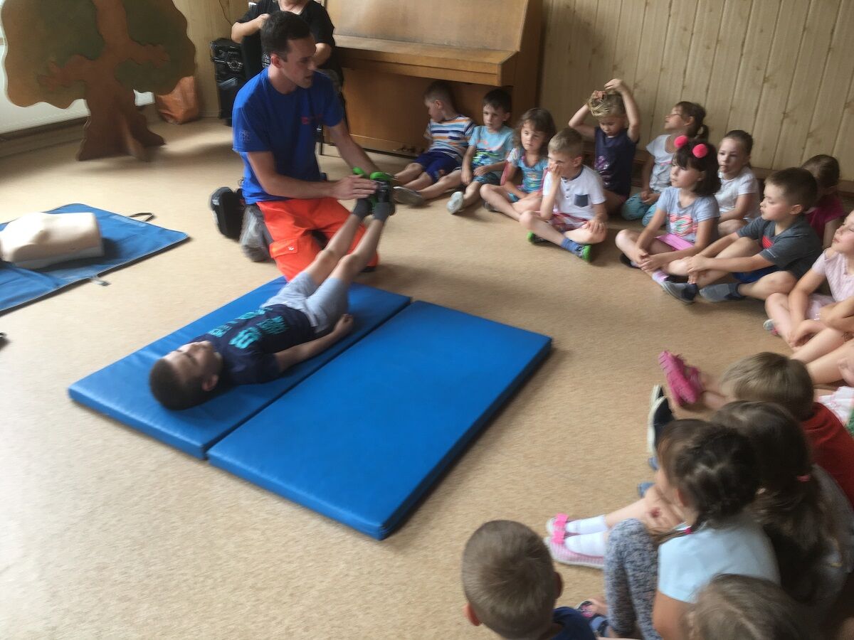 Dzisiaj w naszym przedszkolu odbyło się spotkanie z ratownikami medycznymi firmy „Divmed”. Dzieci z grupy „Mrówki” i „Pszczółki” poznały zasady udzielania pierwszej pomocy osobom potrzebującym, określania czynności życiowym za pomocą zmysłów, układania poszkodowanego oraz sposobu powiadamiania odpowiednich służb. Miały też okazję uczestniczyć w pokazie resuscytacji, działania dwóch defibrylatorów oraz sprzętu do mierzenia poziomu tlenu we krwi oraz ciśnienia. Na zakończenie dzieci oglądały wyposażenie karetki, a także były świadkami udzielania pierwszej pomocy jednemu z kolegów, który obił kolano. Spotkanie z ratownikami wywarło ogromne wrażenie na dzieciach i nauczyło je, jak powinny zachowywać się w sytuacjach zagrożenia zdrowia kolegów i najbliższych.