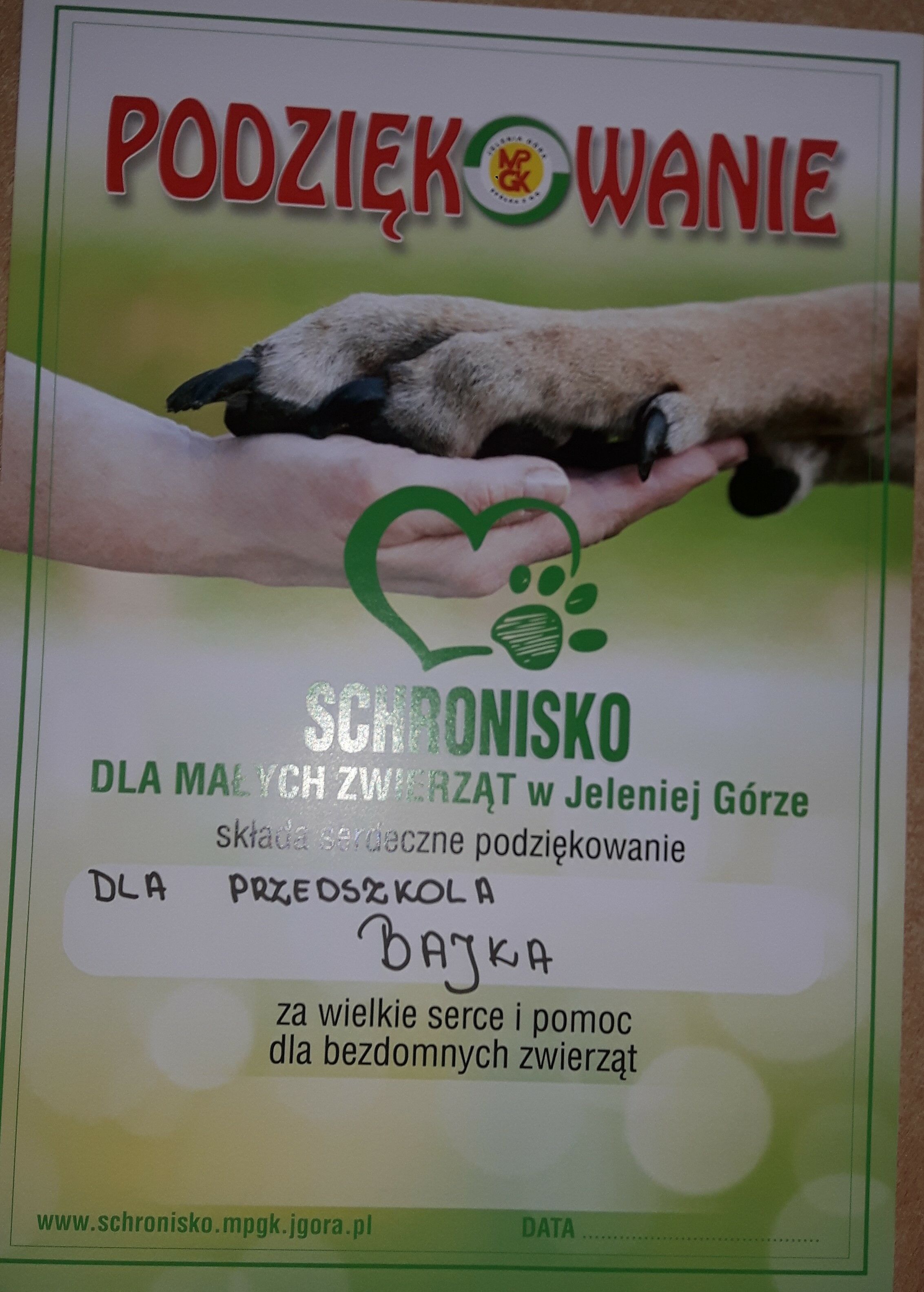 Całkiem niedawno (26.10.2019’) nasze przedszkole wznowiło współpracę ze schroniskiem dla małych zwierząt w Jeleniej Górze. Gościliśmy u nas panią Anię, kierowniczkę schroniska wraz z pupilem o imieniu Mecenas. Co prawda znalazł on już dom dla siebie, ale nasi podopieczni wraz z personelem podjęli decyzję o dalszym wspieraniu schroniska i porzucanych zwierząt. Mamy nadzieję, że symboliczna złotówka (1 zł) raz w miesiącu nie będzie zbyt dużym uszczupleniem dla domowego budżetu. Ta niewielka kwota pozwoli znacznie poprawić warunki bytowe naszych pupili.