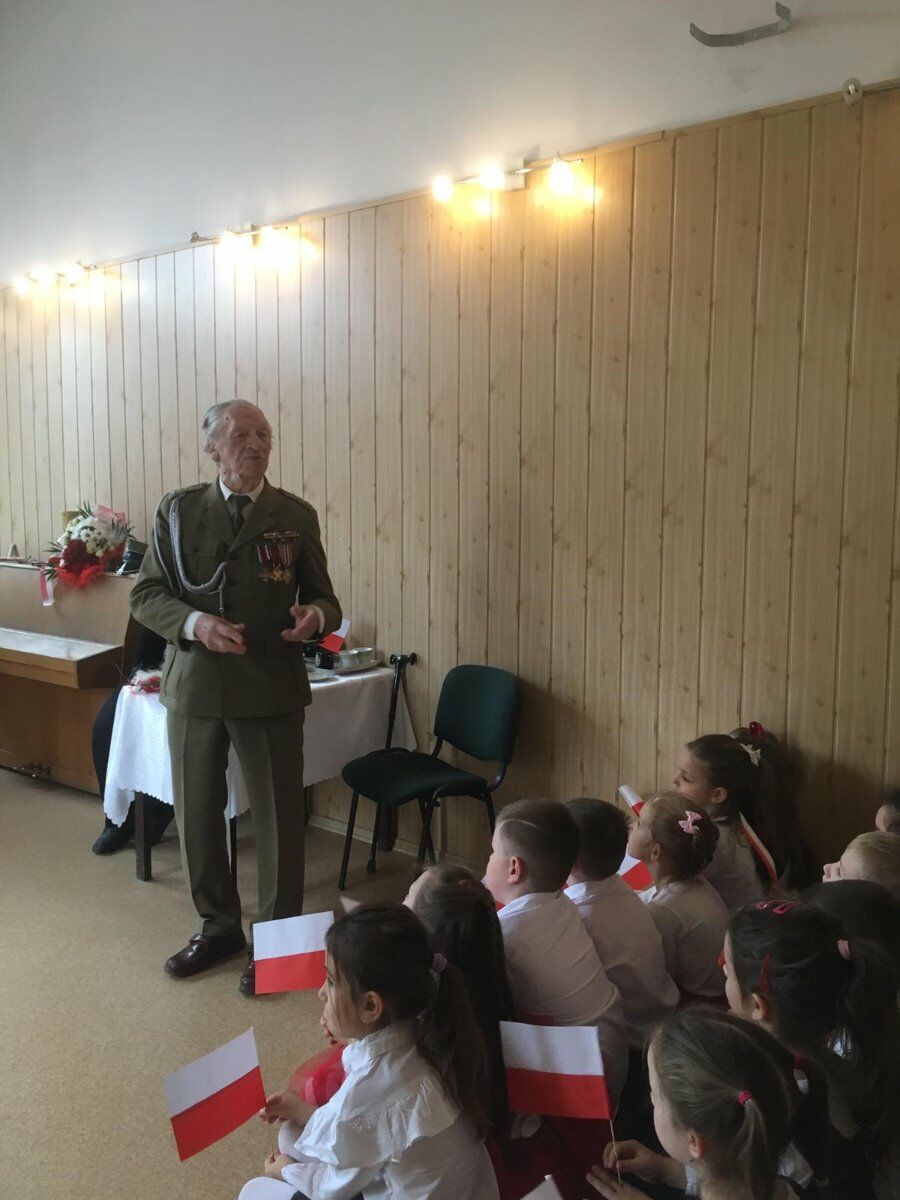Część artystyczną zwieńczył odśpiewany przez przedszkolaki Hymn w asyście pocztu flagowego. Dzieci ze starszych grup z zaciekawieniem słuchały wspomnień i pieśni zaproszonego gościa będącego żywą historią narodu polskiego. Ciekawe doświadczeń wojskowego zadawały wiele pytań, na które starszy pan chętnie odpowiadał.