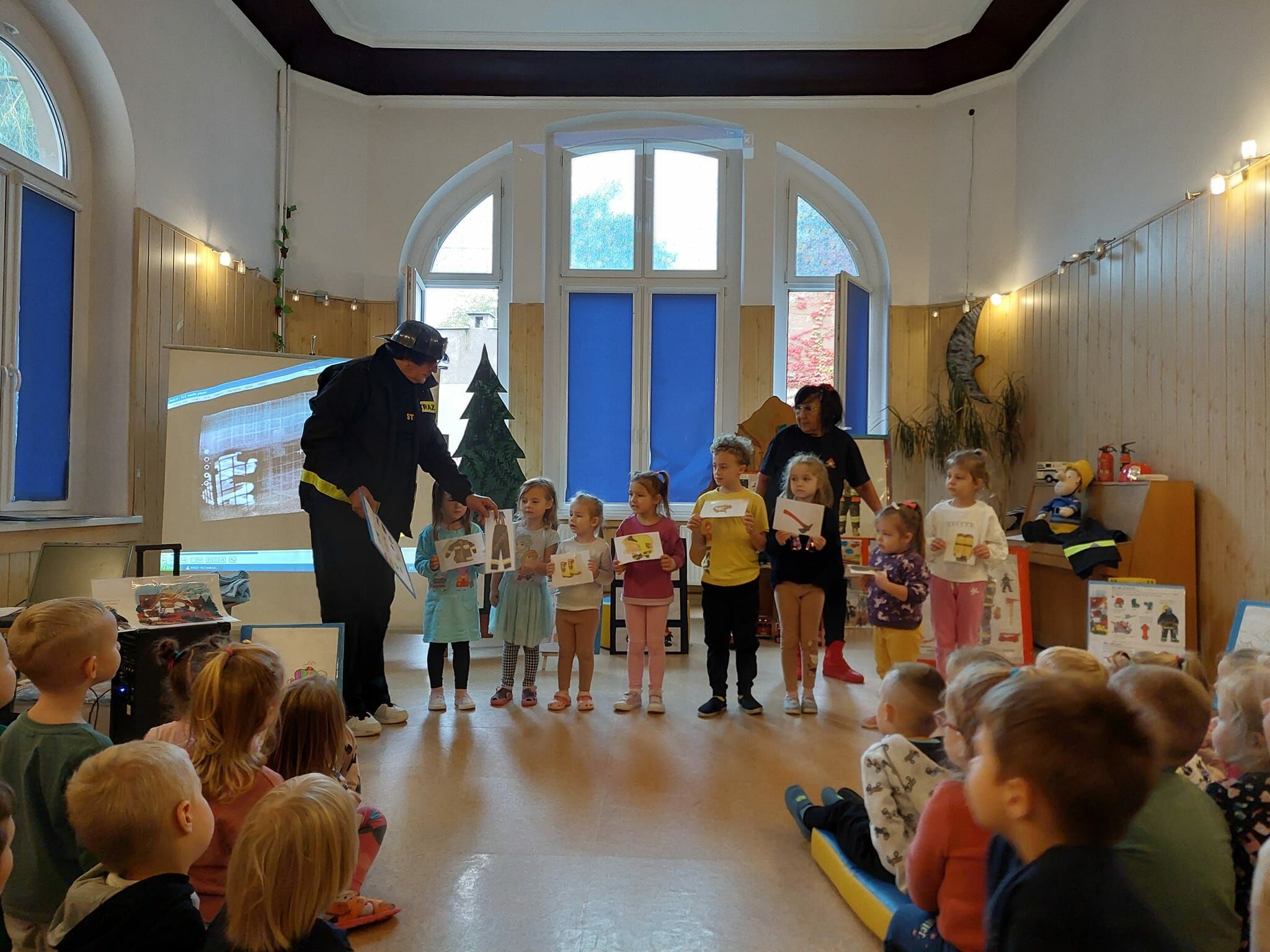 Przedszkolaki z zaciekawieniem obejrzały interesujący film o pracy strażaków. Były rozmowy poparte planszami, pokazem rekwizytów niezbędnych w pracy strażaka, animacje, scenki dramowe z udziałem dzieci, zabawy edukacyjno- ruchowe, krzyżówki, a wszystko to pod hasłem ,,Stop pożarom – bezpieczny przedszkolak”. Nie zabrakło też konkursów. Po tych zajęciach każdy przedszkolak na pewno stał się bogatszy o nowe doświadczenia i informacje.