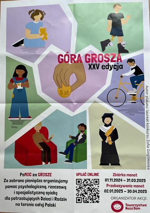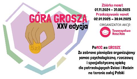 Po raz kolejny przedszkole nasze przystąpiło do akcji ,,Góra Grosza” organizowanej przez Towarzystwo Nasz Dom. W każdej grupie znajdować się będzie specjalnie przygotowana na ten cel skarbonka.