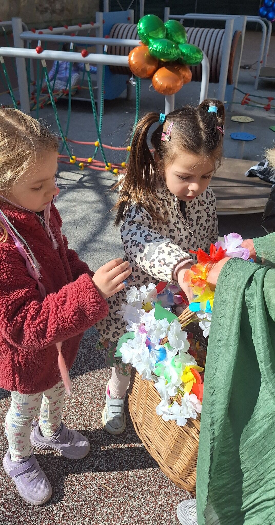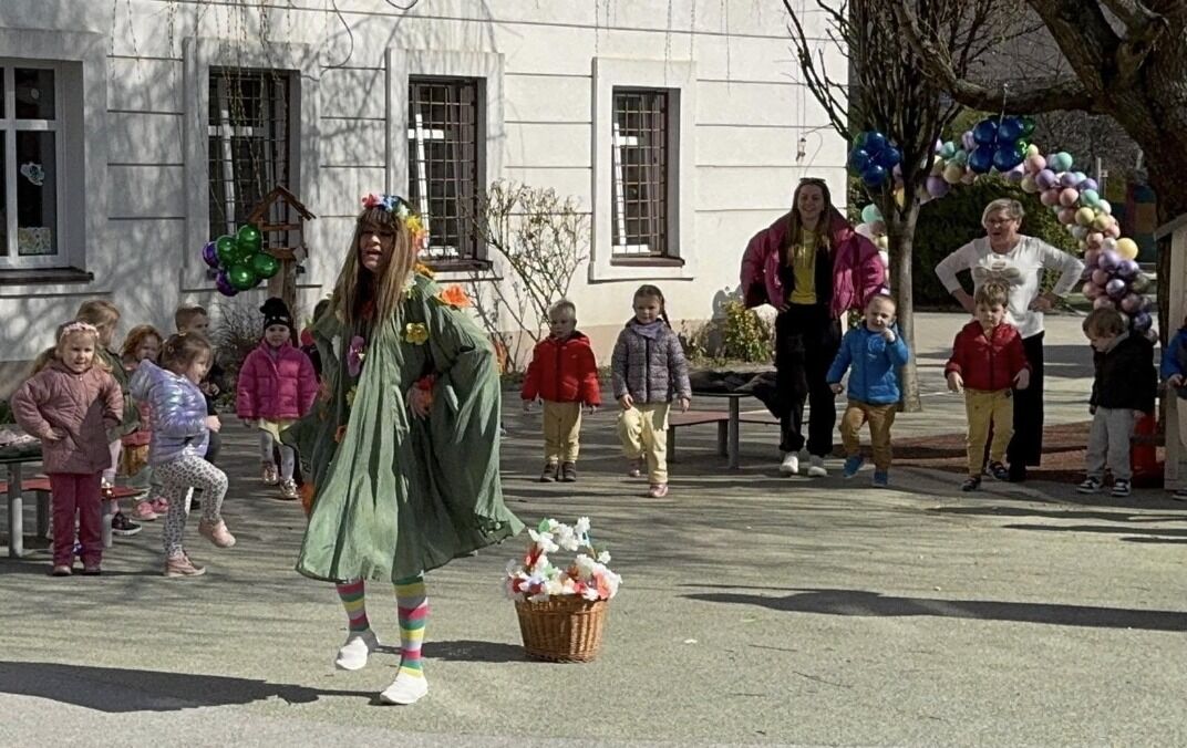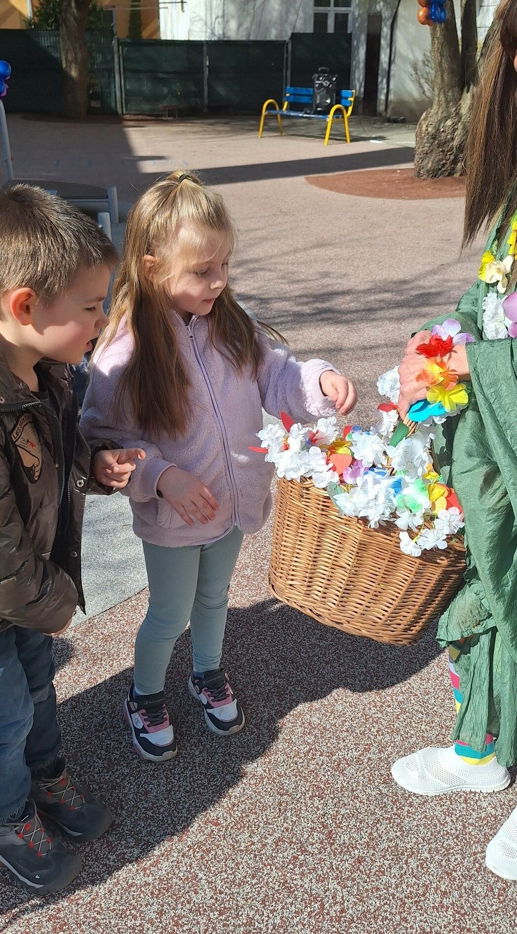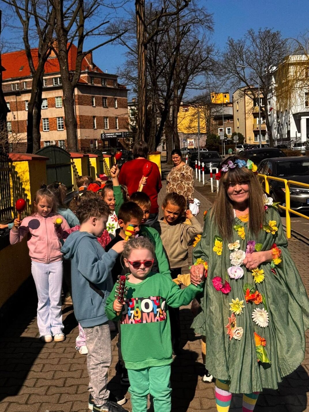 Od kilku dni przedszkole szykowało się na nadejście tej pory roku. Korytarze i sale rozkwitły przybrane w dekoracje i prace dzieci, a przedszkolaki z akcentem zieleni i żółtego w swym ubiorze podkreśliły ten uroczysty dzień. Słoneczny piątek zgromadził najmłodsze i starsze przedszkolaki w ogrodzie przedszkolnym, by rozpocząć wiosenną przygodę z Panią Wiosną przy wtórze radosnych okrzyków, śpiewu i tańca. Przybyła Wiosna rozdawała cukierki zamiast kwiatów, którym zima nie dała obudzić się na całego. Starszaki zaś udały się z Wiosenką na ulice miasta ogłaszając nadejście upragnionej pory roku.